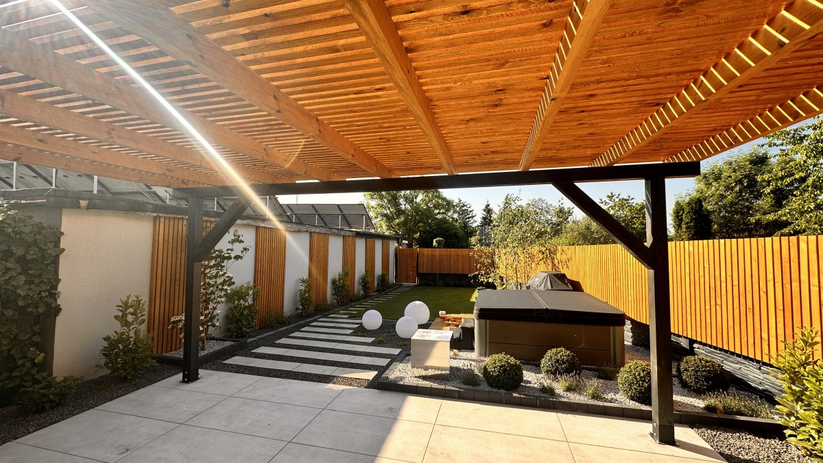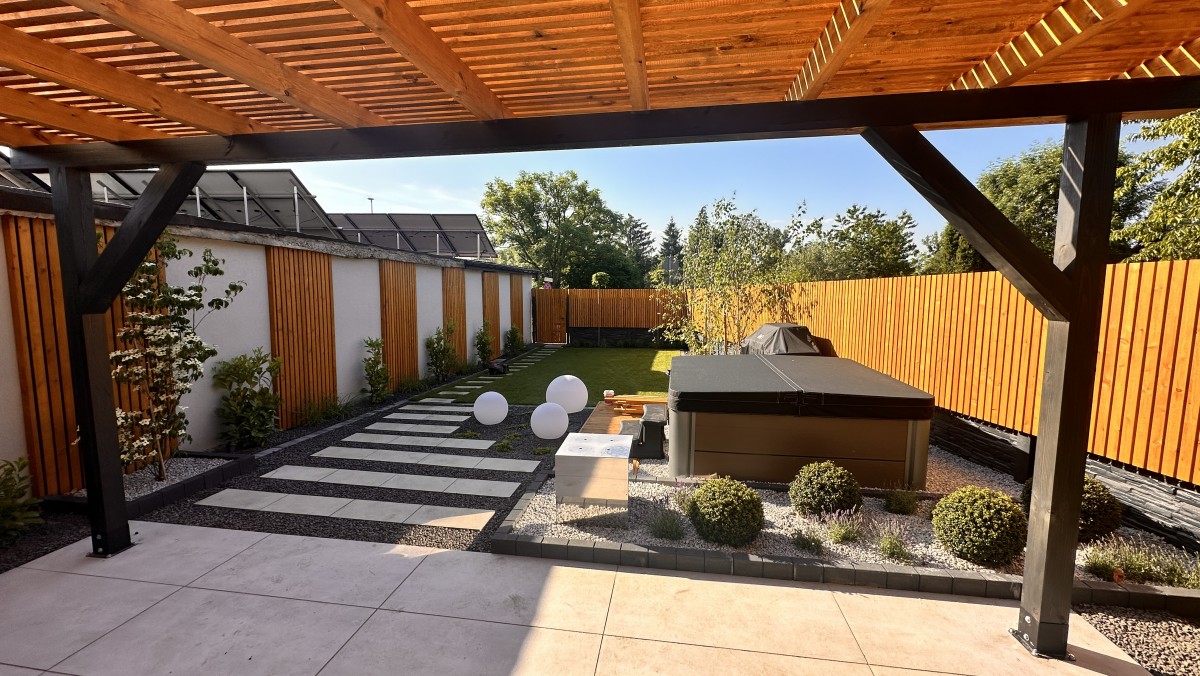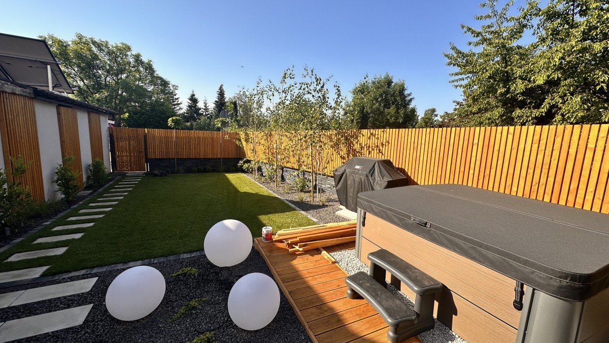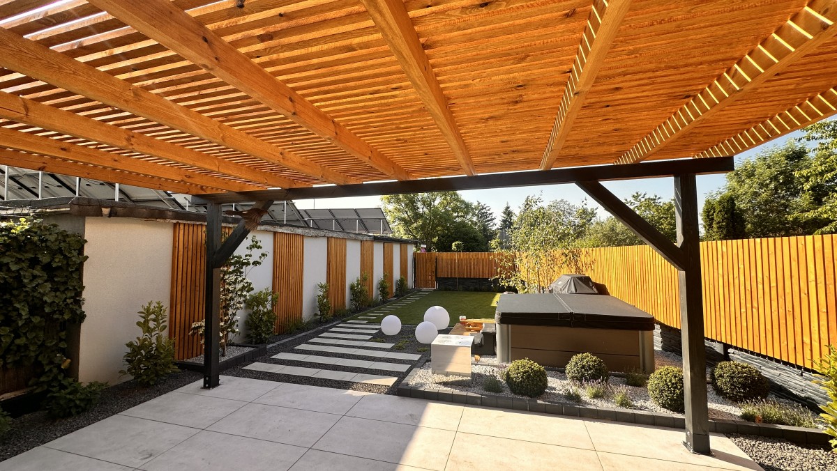 Prezentowany poniżej ogród powstał z chęci do wypoczynku oraz relaksu. Aby zapewnić intymność oraz zasłonięcie od sąsiadów powstał płot drewniany, który nawiązuje do pergoli oraz tarasu. Nowoczesny projekt z elementami wodnymi daje duże poczucie estetyki, ale i ciepła.