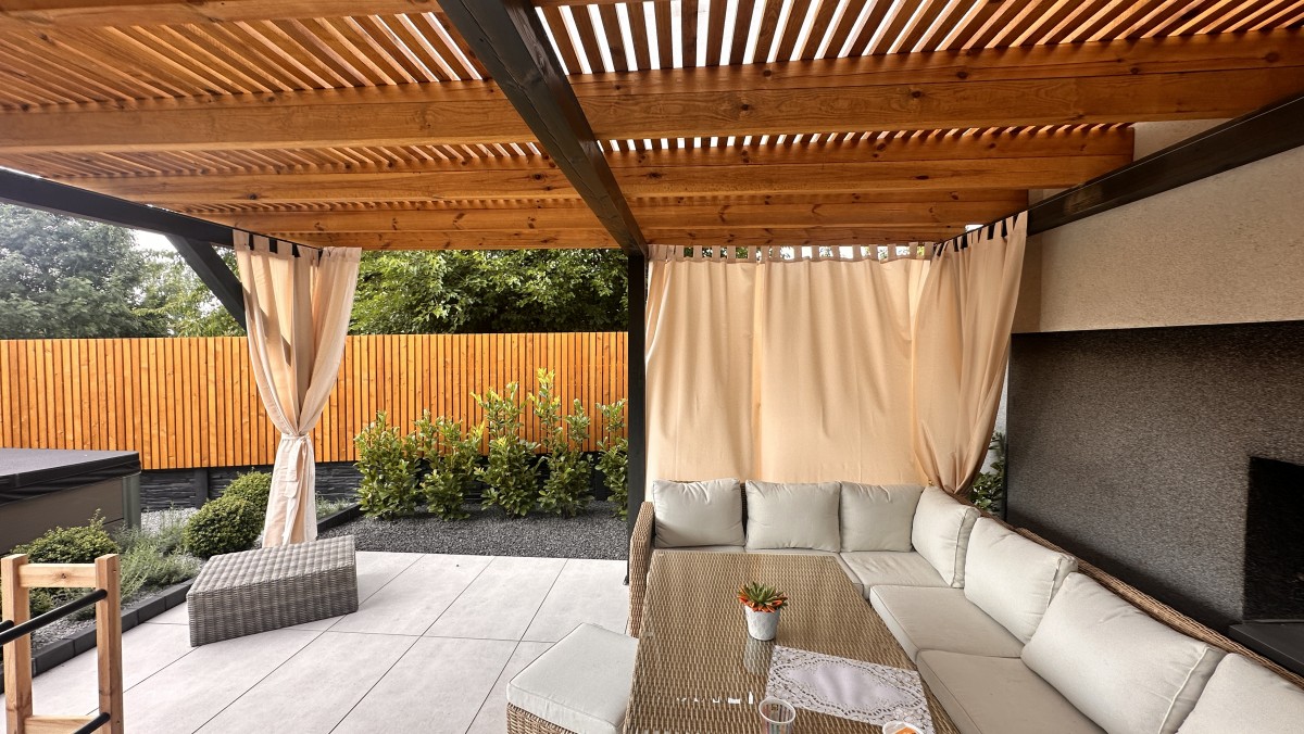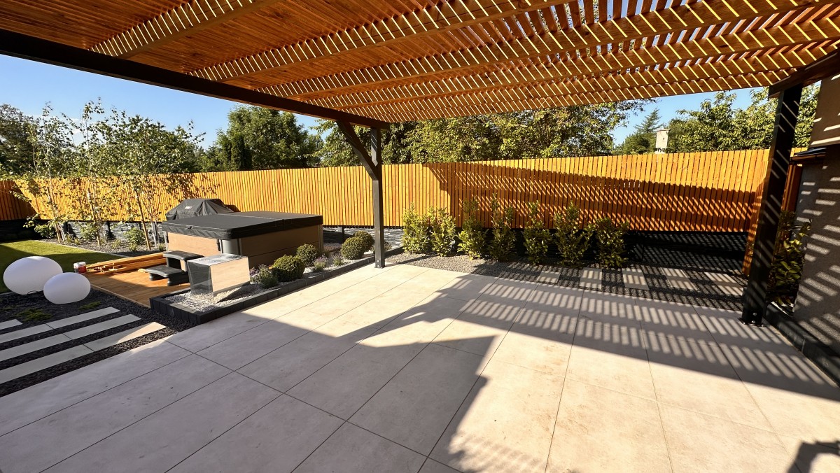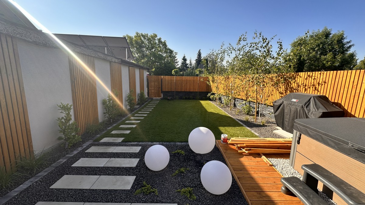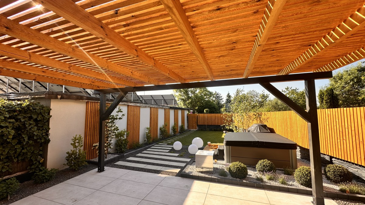 Prezentowany poniżej ogród powstał z chęci do wypoczynku oraz relaksu. Aby zapewnić intymność oraz zasłonięcie od sąsiadów powstał płot drewniany, który nawiązuje do pergoli oraz tarasu. Nowoczesny projekt z elementami wodnymi daje duże poczucie estetyki, ale i ciepła.