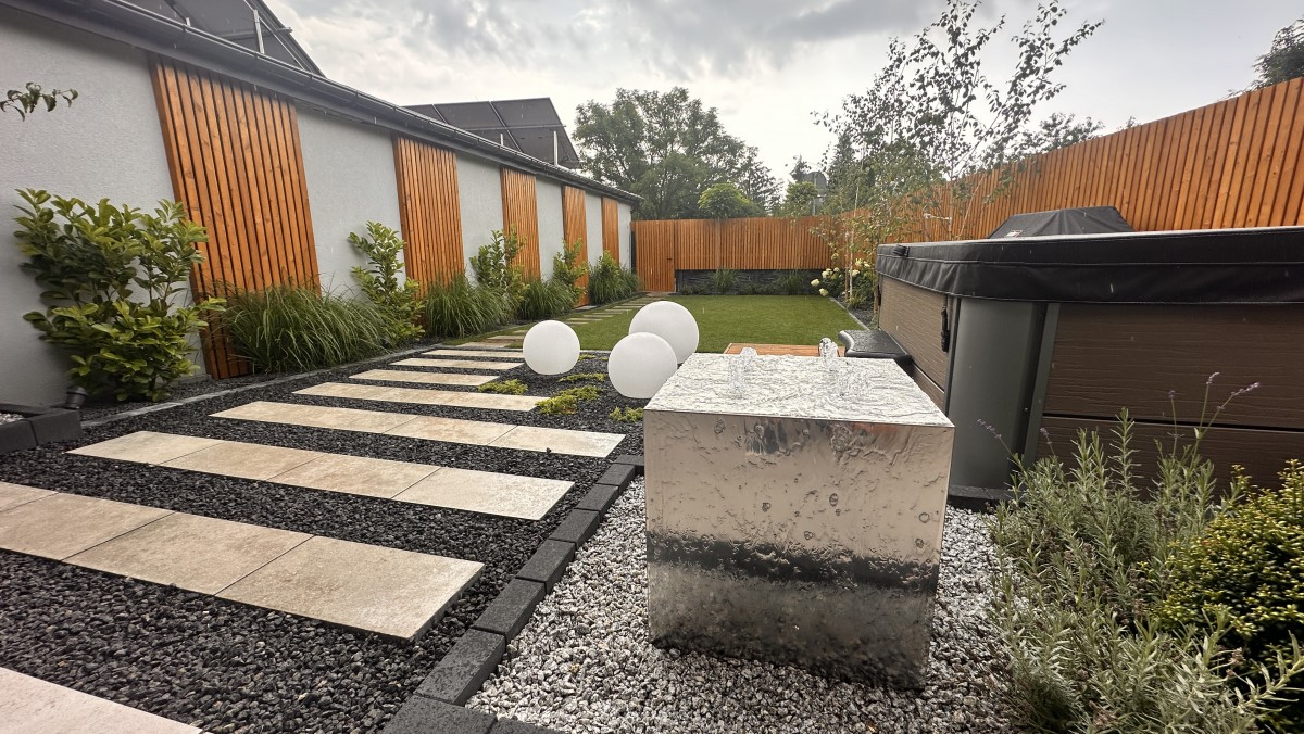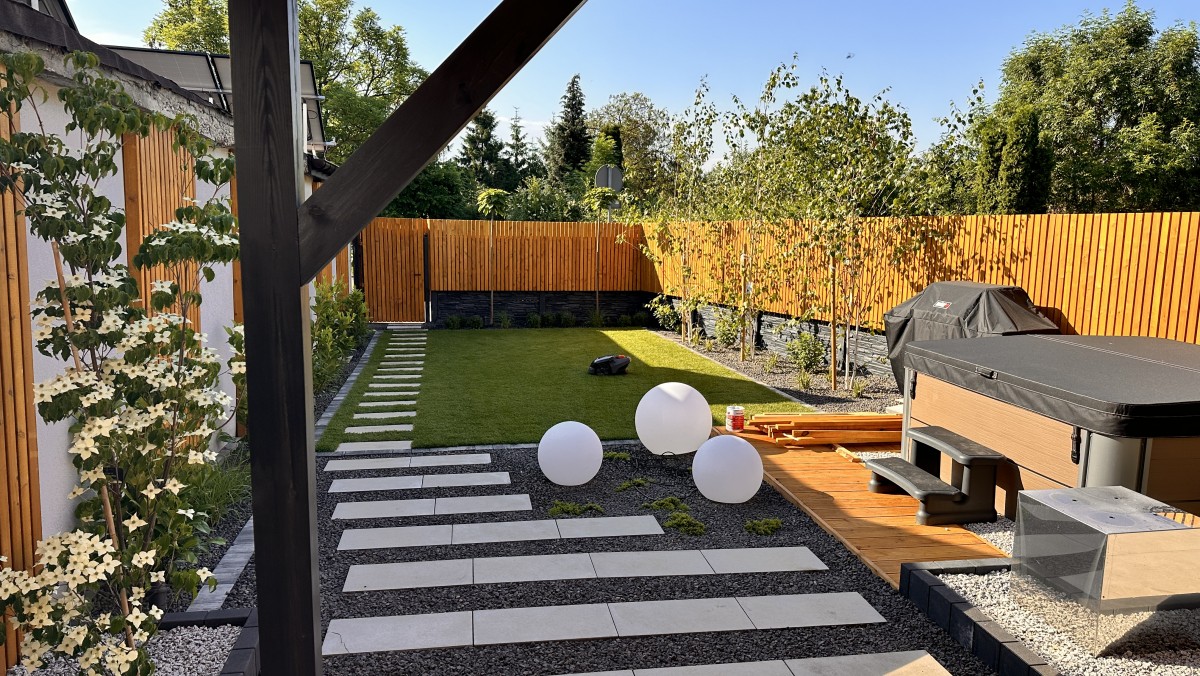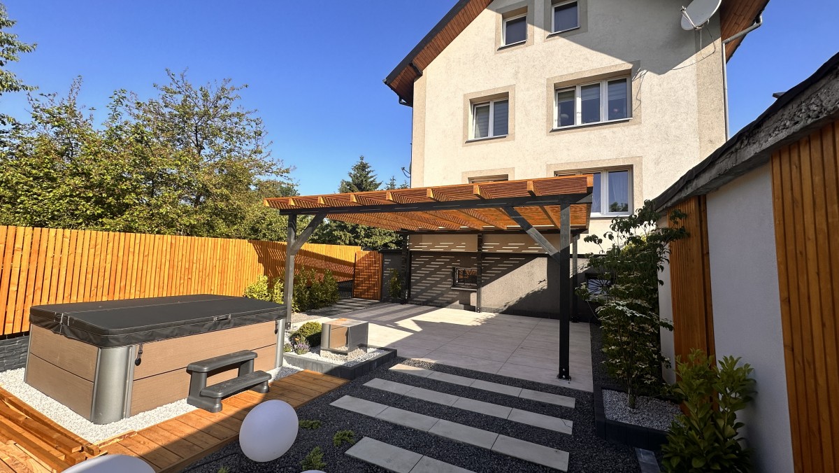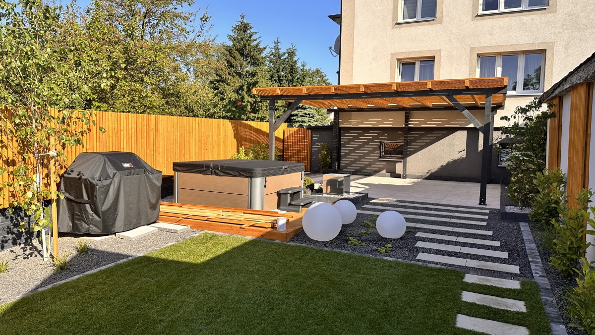 Prezentowany poniżej ogród powstał z chęci do wypoczynku oraz relaksu. Aby zapewnić intymność oraz zasłonięcie od sąsiadów powstał płot drewniany, który nawiązuje do pergoli oraz tarasu. Nowoczesny projekt z elementami wodnymi daje duże poczucie estetyki, ale i ciepła.