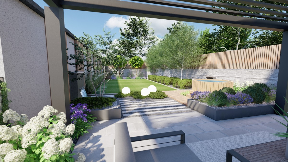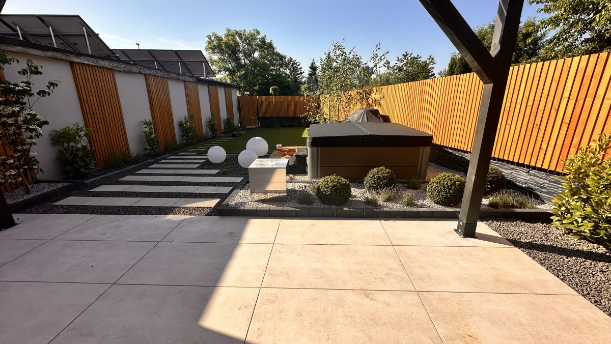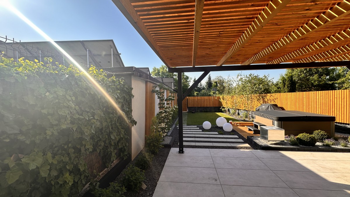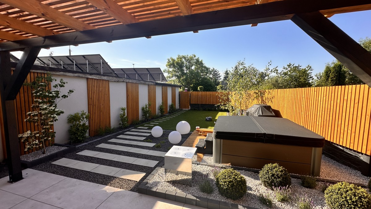 Prezentowany poniżej ogród powstał z chęci do wypoczynku oraz relaksu. Aby zapewnić intymność oraz zasłonięcie od sąsiadów powstał płot drewniany, który nawiązuje do pergoli oraz tarasu. Nowoczesny projekt z elementami wodnymi daje duże poczucie estetyki, ale i ciepła.